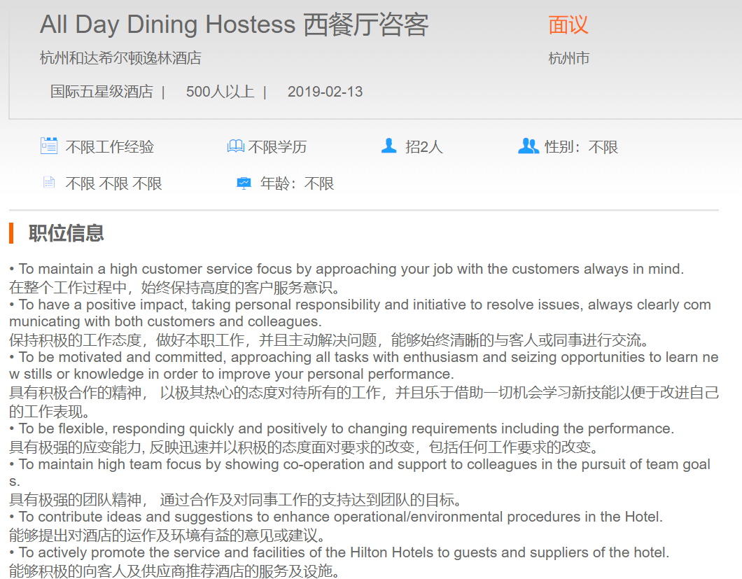 杭州和达希尔顿逸林酒店西餐厅咨客