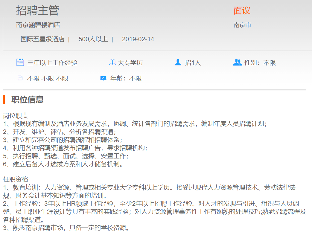 南京涵碧楼酒店招聘主管
