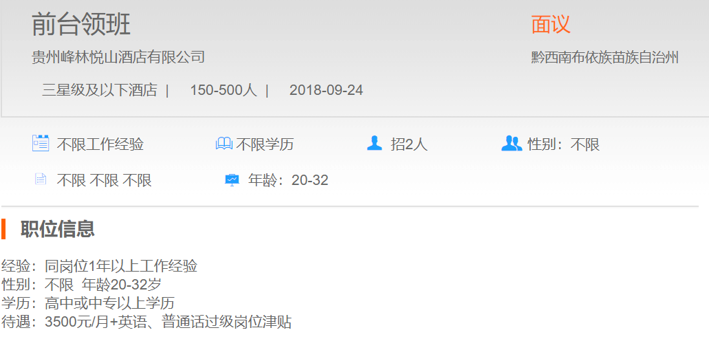 贵州峰林悦山酒店有限公司前台领班