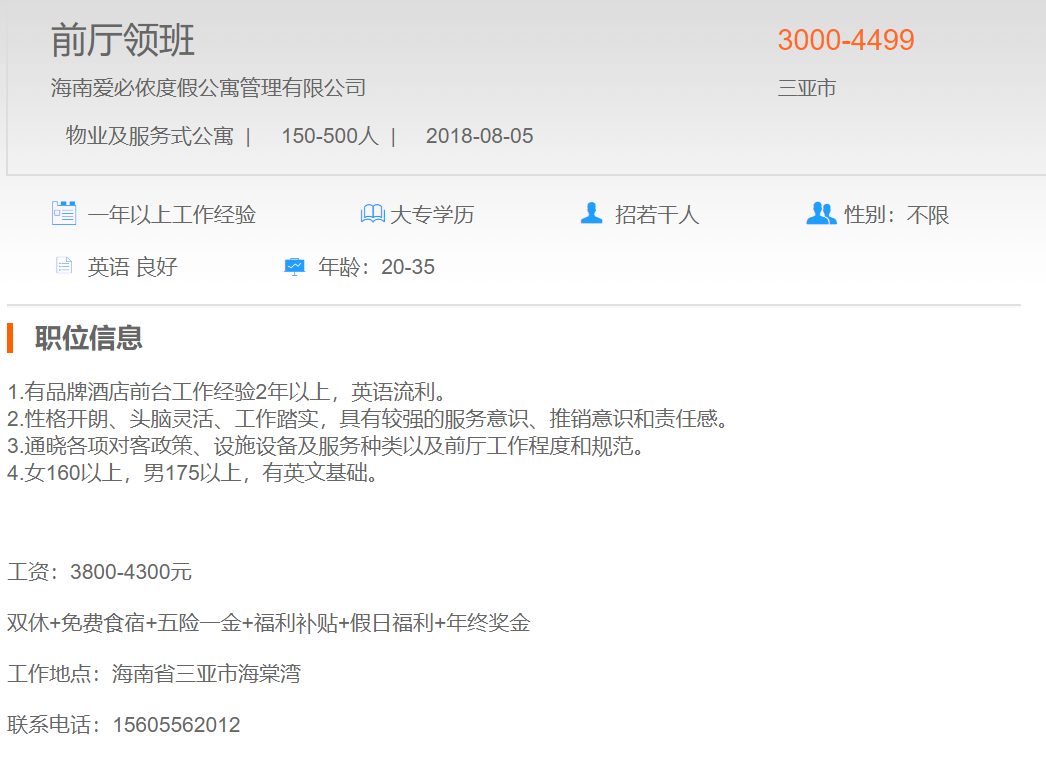海南爱必侬度假公寓管理有限公司前台领班
