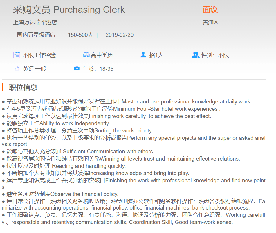 上海万达瑞华酒店采购文员