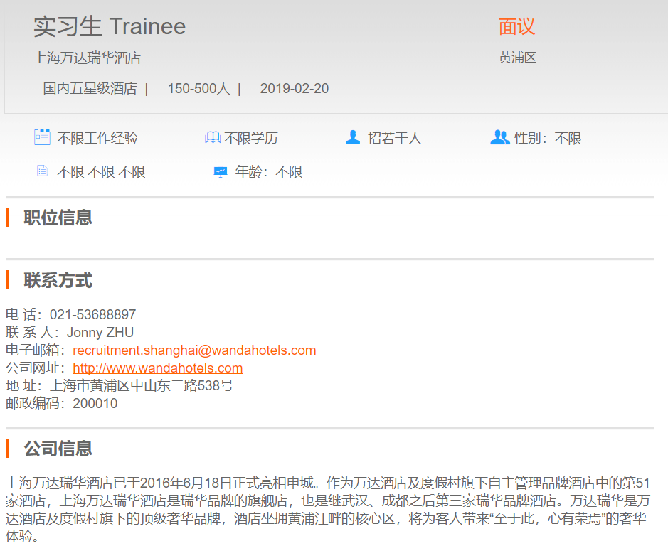 上海万达瑞华酒店实习生