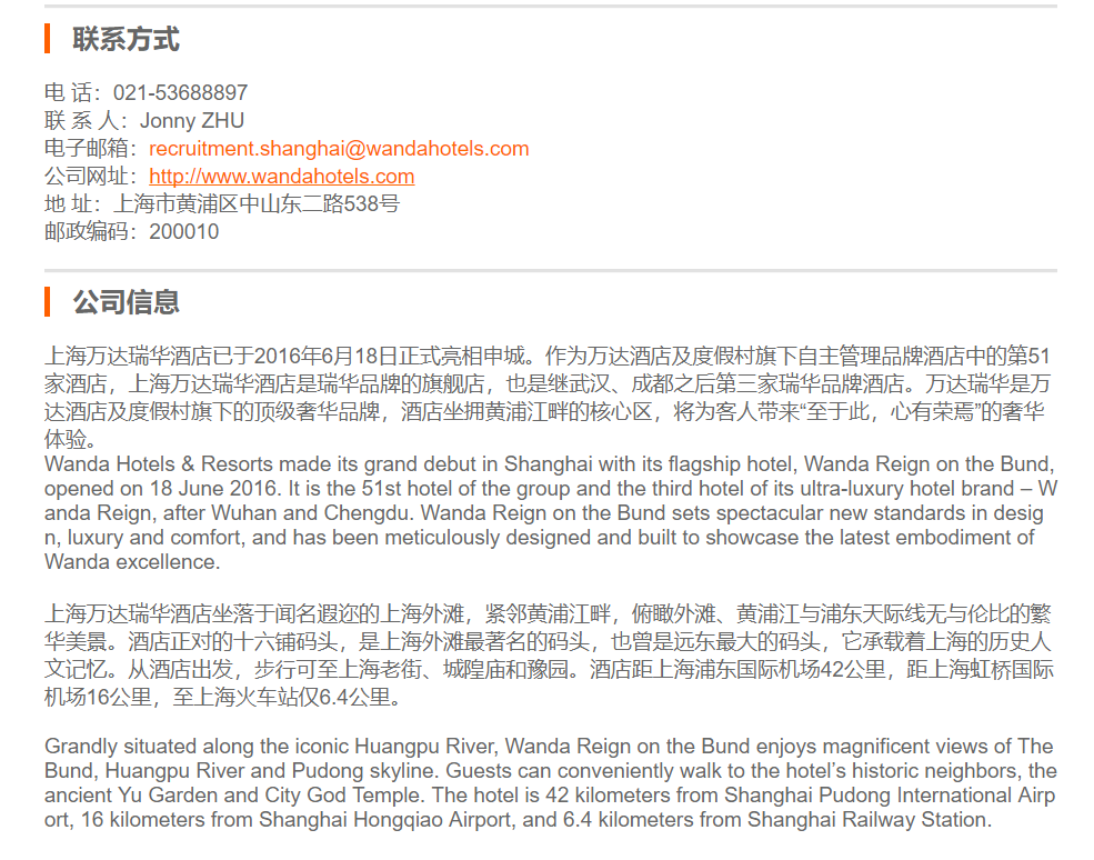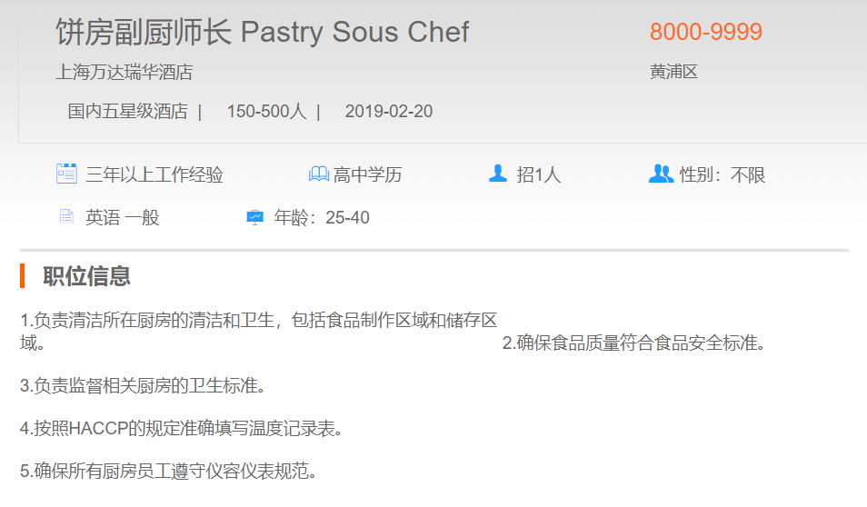 上海万达瑞华酒店饼房副厨师长
