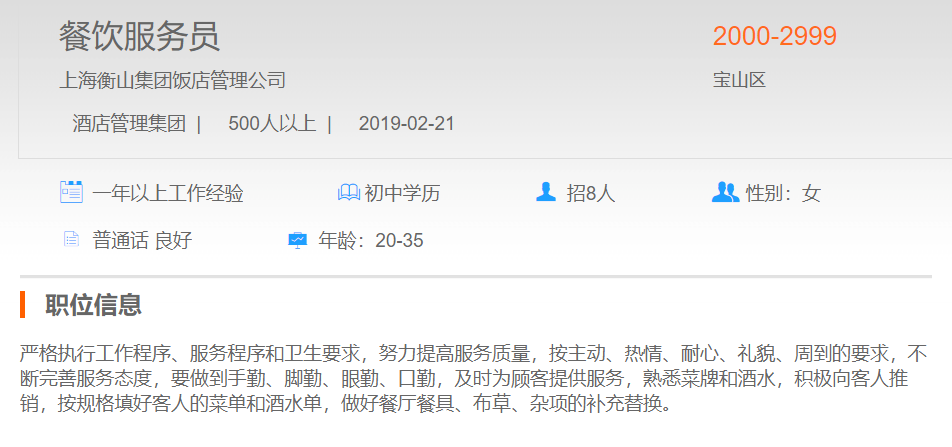 上海衡山集团饭店管理公司餐饮服务员