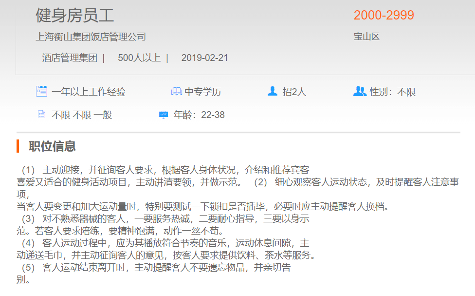 上海衡山集团饭店管理公司健身房员工