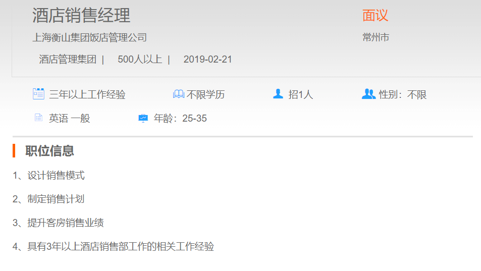 上海衡山集团饭店管理公司酒店销售经理
