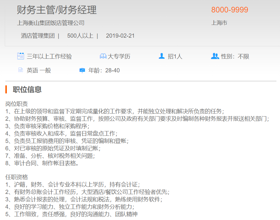 上海衡山集团饭店管理公司财务主管