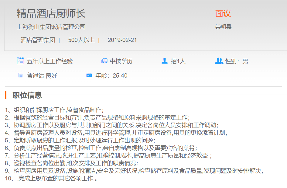 上海衡山集团饭店管理公司精品酒店厨师长