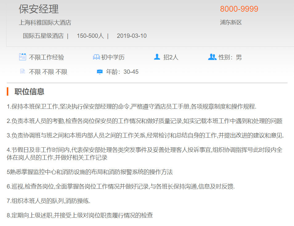 上海科雅国际大酒店保安经理