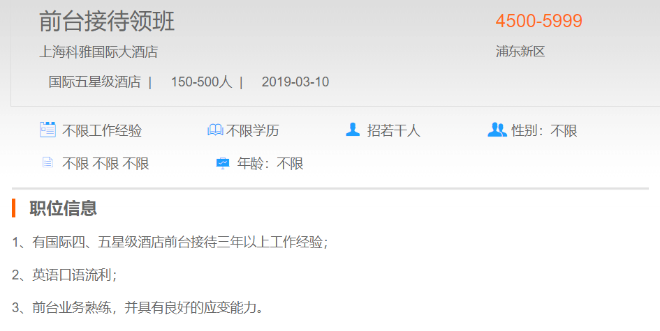 上海科雅国际大酒店前台接待领班