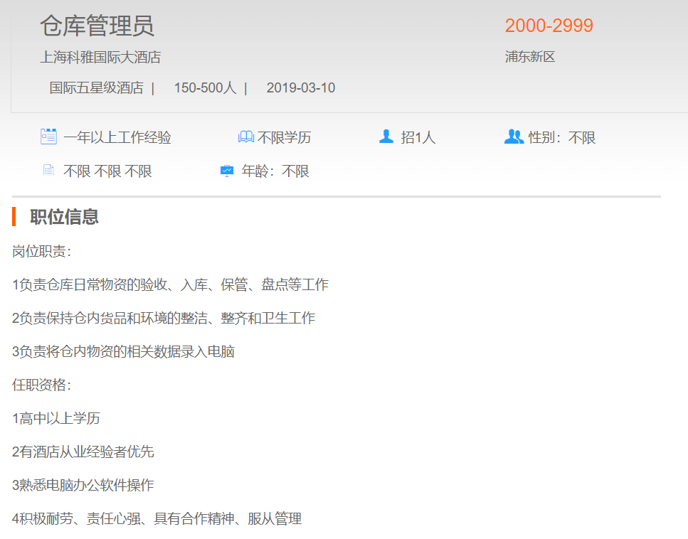 上海科雅国际大酒店仓库管理员