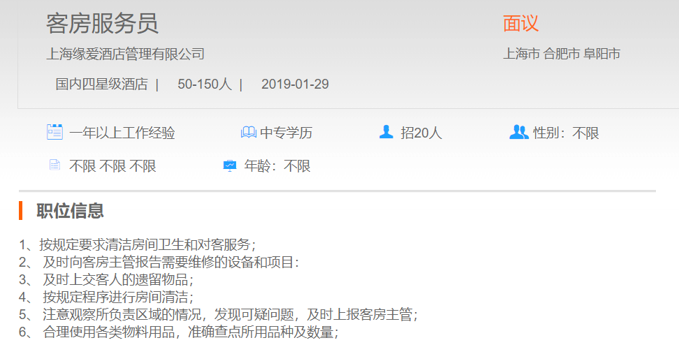 上海缘爱酒店管理有限公司客房服务员