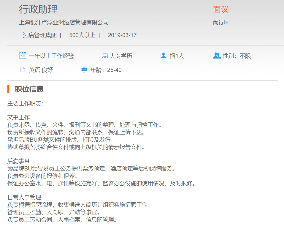 上海锦江卢浮亚洲酒店管理有限公司行政助理