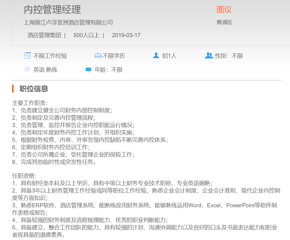 上海锦江卢浮亚洲酒店管理有限公司内控管理经理