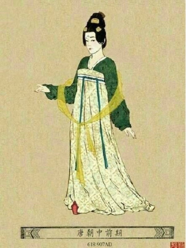 唐代女服主要为裙、衫、帔。襦裙是唐代妇女的主要服式。在隋代及初唐时期,妇女的短襦都用小袖,下着紧身长裙,裙腰高系,一般都在腰部以上,有的甚至系在腋下,并以丝带系扎,给人一种俏丽修长的感觉。