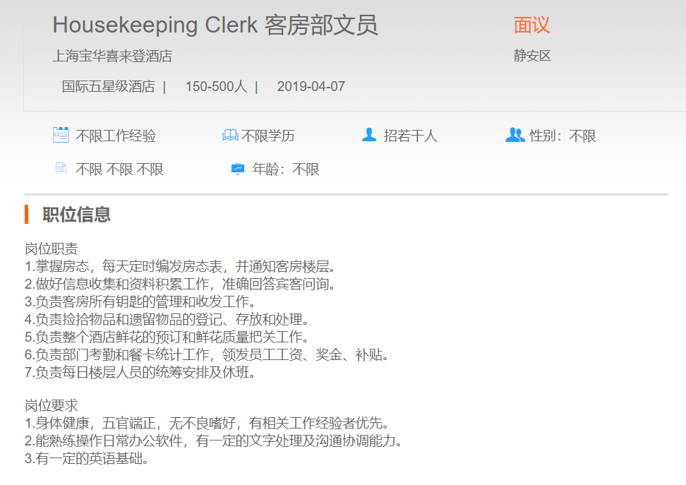 上海宝华喜来登酒店客房部文员