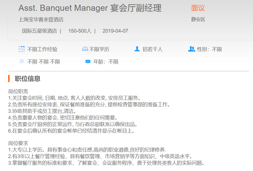上海宝华喜来登酒店宴会厅副经理