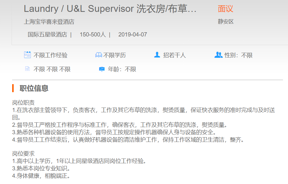 上海宝华喜来登酒店洗衣房/布草间督导