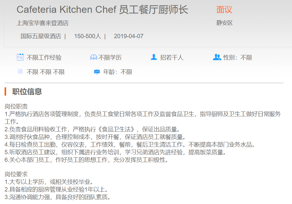 上海东郊喜来登酒店员工餐厅厨师长