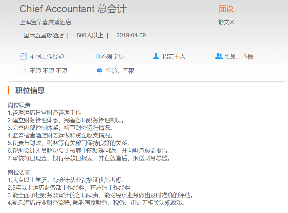 上海宝华喜来登酒店总会计