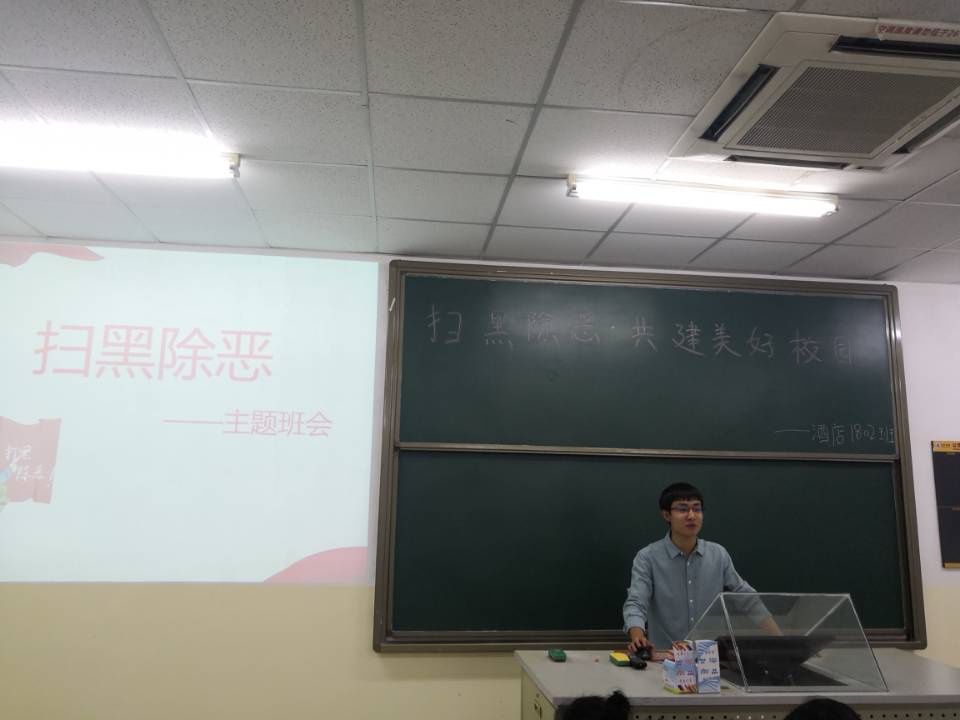 4月10日19时,酒店1802班于书知楼2203教室开展了关于“扫黑除恶”的主题班会。本班学生五十多人参与其中,由胡钱林主讲,他在宣讲过程中很大的鼓舞了班级的学生,激发了学生同黑恶势力作斗争的决心和勇气,更进一步净化了校园的环境,保证了学生学习及教学的顺利进行。