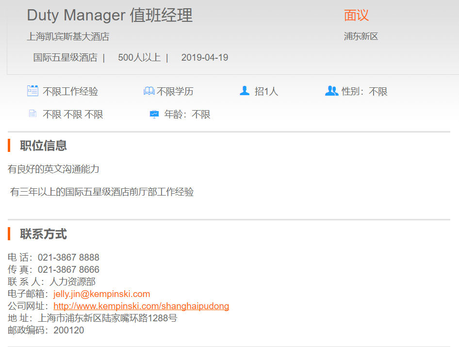 上海凯宾斯基大酒店值班经理