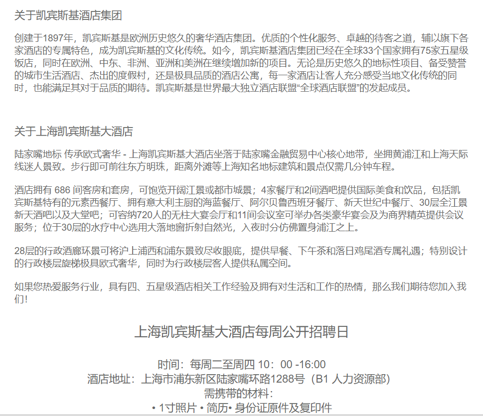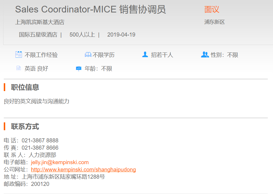 上海凯宾斯基大酒店销售协调员