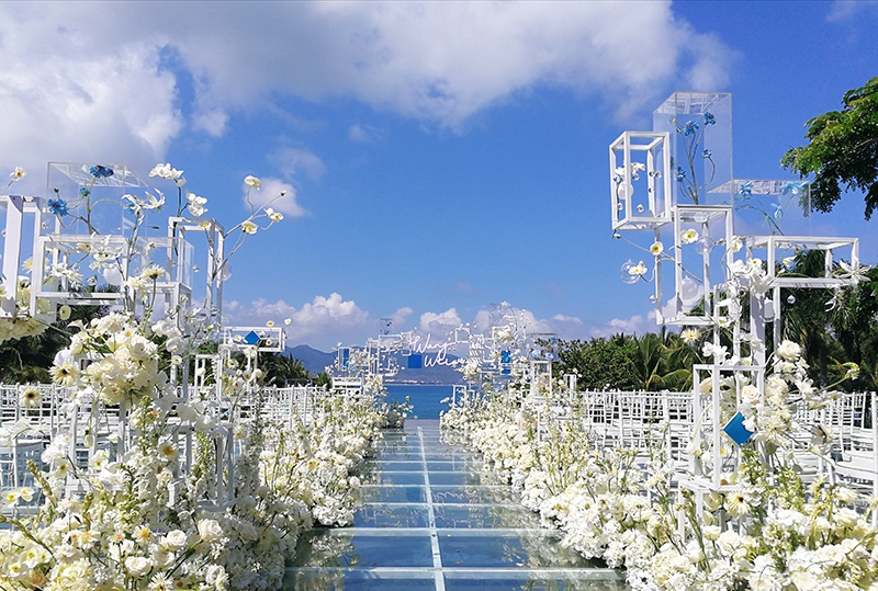 本次婚礼整体呈简约风格,纯白色调,背景是三亚太阳湾柏悦酒店蓝天、碧海、绿山的自然风光,金色的沙滩,成林的高大椰树无处不透着满满的热带风情,由于酒店设计以结构性为主,因而本场婚礼添加了许多方块元素,随处可见的立方体,搭配白色系花艺,白玫瑰、兰花、菊花、向日葵等等象征着纯洁的婚礼以及美好的爱情。