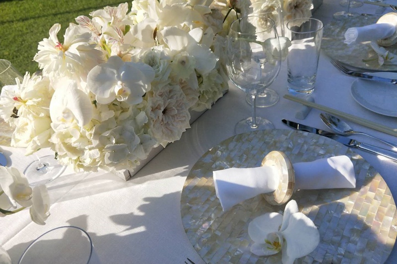 婚礼布置除了以上的整体的设计,其他细节也是至关重要的,例如餐具的搭配摆放,餐桌上的鲜花点缀等等,本次活动餐具选择了以金色为主,整齐地摆列在布满鲜花的长桌上,盘子上是一朵完整的白色小花和叠成书卷样的餐布,干净的高脚杯安静的排成一排,简单却透着雅致。