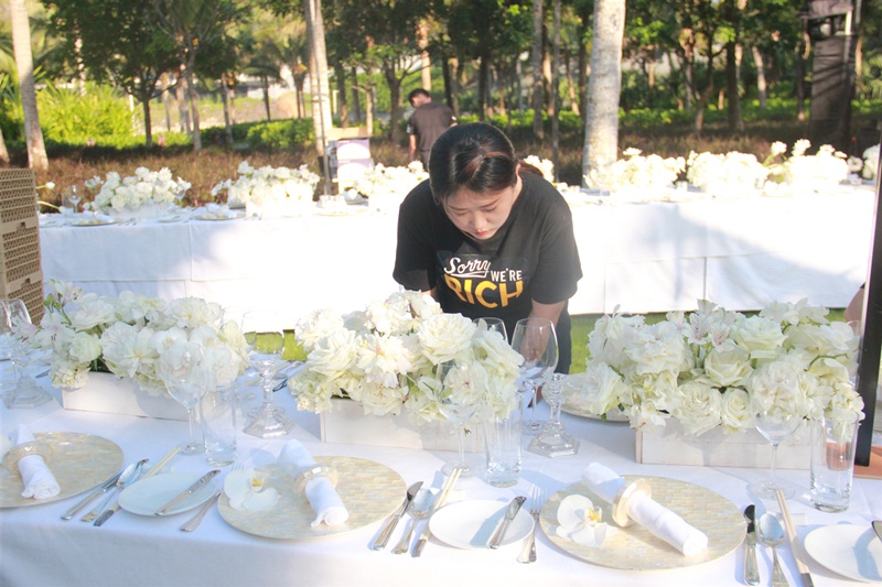 现场布置结束后,所有人员处理草地上遗留下来的垃圾,做最后的修整工作,保证这场甜蜜的婚礼能以最好的样子呈献给即将入场的新人。