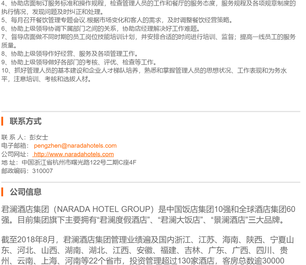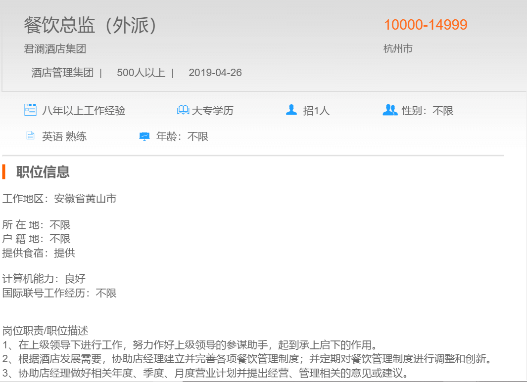 君澜酒店集团餐饮总监(外派)