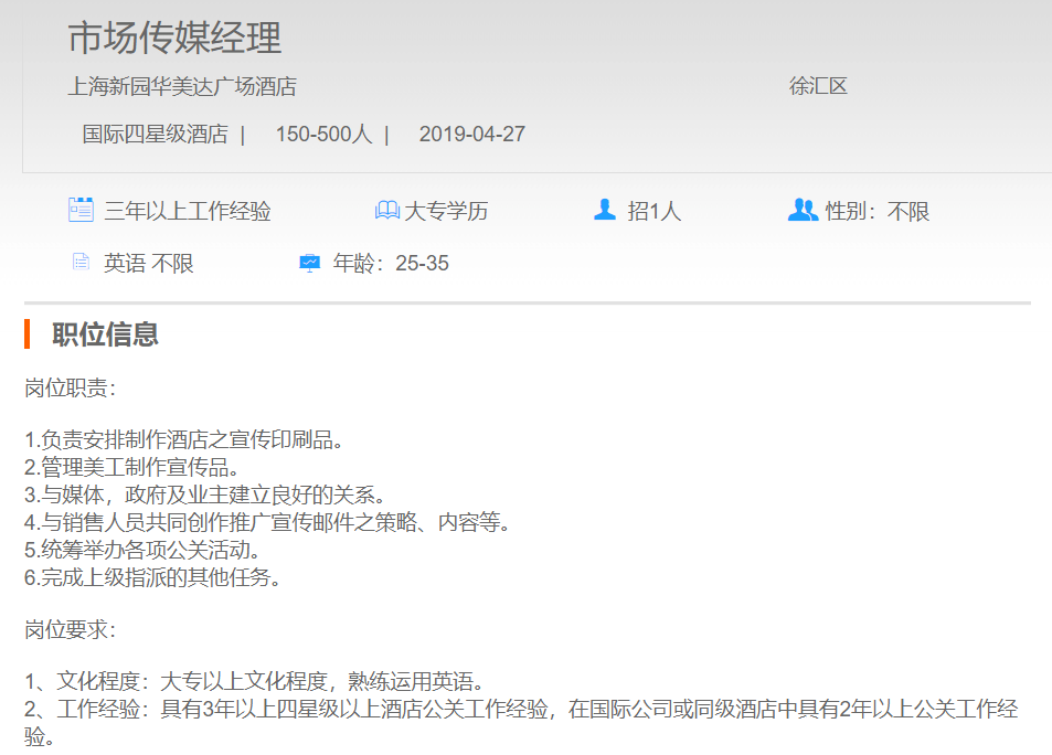 上海新园华美达广场酒店市场传媒经理
