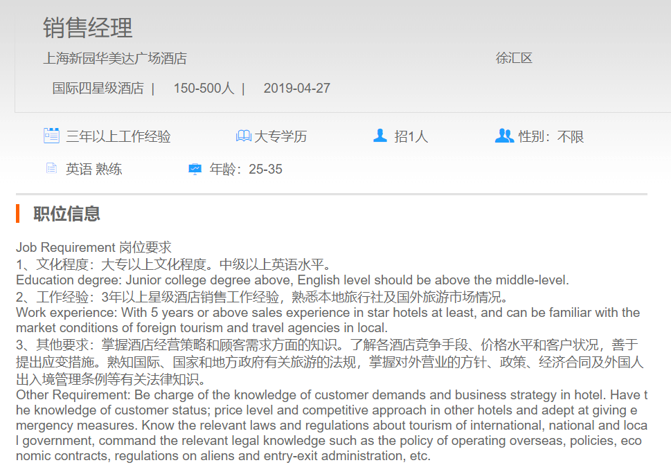 上海新园华美达广场酒店销售经理