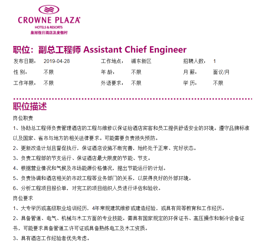 上海滴水湖皇冠假日酒店副总工程师