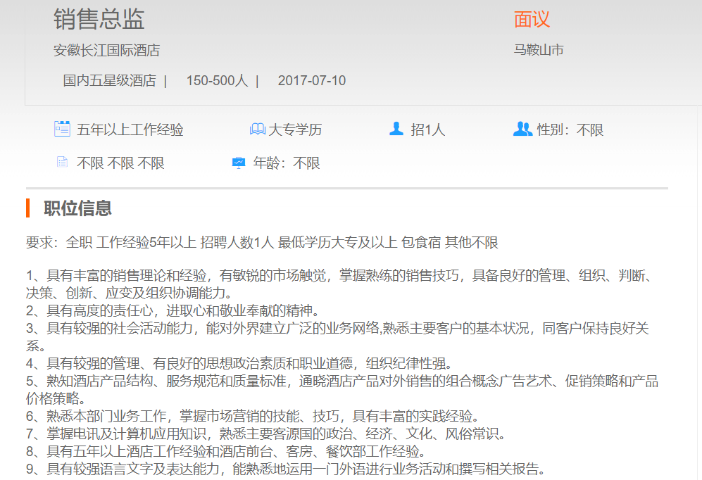 安徽长江国际酒店市场销售总监
