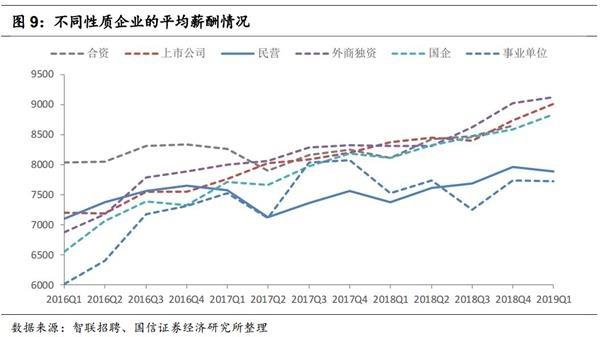 从平均薪酬的细分来看:(1)从不同城市的平均薪酬来看,多数城市的平均薪酬在2019年一季度环比出现下降,在统计的37个城市中,仅9个城市的平均薪酬环比有所上升。平均薪酬超过1万的城市依然只有北京和上海,且两者的平均薪酬在一季度的环比亦出现上升,它们的平均薪酬分别为10970和10274;(2)从不同性质企业的平均薪酬来看,处于平均薪酬第一梯队的企业,它们的平均薪酬在2019年一季度环比依然平稳上涨,其中上市公司和国企平均薪酬的环比涨幅最大,分别为3.0%和2.9%,平均薪酬分别为9007和9125元。而民营企业和事业单位的平均薪酬环比则小幅下降。具体来看: