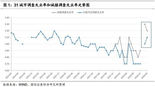 根据国家统计局的数据,截止2019年3月,31城市的调查失业率为5.1%,处于近两年以来的较高水平;城镇调查失业率为5.2%,亦是处于近年来较高水平。相比于2018年来说,失业率在2019年一季度的“跳升”反映了当前就业市场形势的严峻,稳就业的压力依然存在。