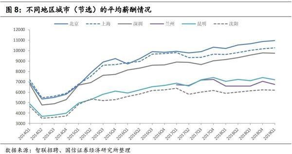 (1)从不同城市的平均薪酬来看,多数城市的平均薪酬在2019年一季度环比出现下降,在统计的37个城市中,仅9个城市的平均薪酬环比有所上升。平均薪酬超过1万的城市依然只有北京和上海,且两者的平均薪酬在一季度的环比亦出现上升,它们的平均薪酬分别为10970和10274。从同比增速来看,多数城市平均薪酬的同比是上升的,仅海口和乌鲁木齐的平均薪酬同比略有下降。另外,武汉在2019年一季度的平均薪酬为7653元,是所有城市中同比上行幅度最高的,约为8.1%。