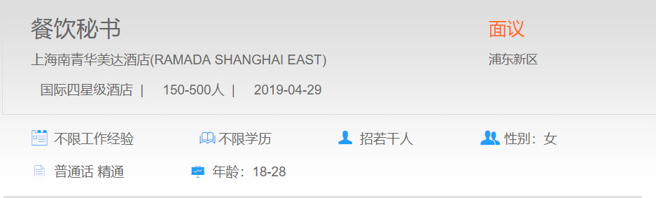 上海南青华美达酒店餐饮秘书