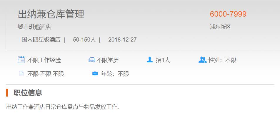 城市琪遇酒店出纳兼仓库管理