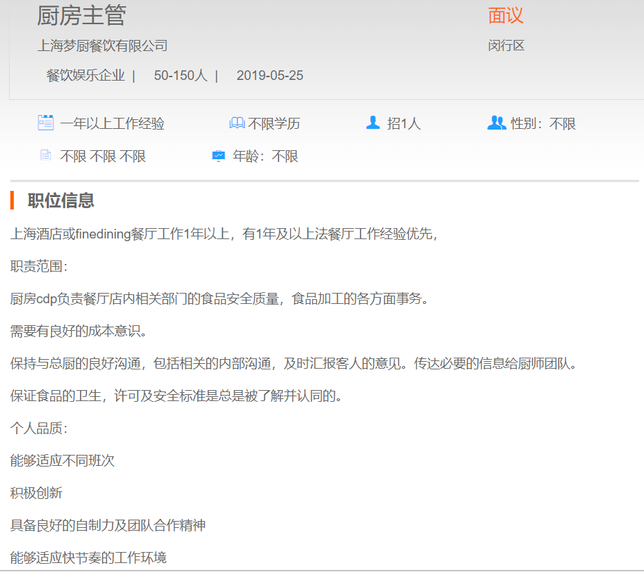 上海梦厨餐饮有限公司厨房主管