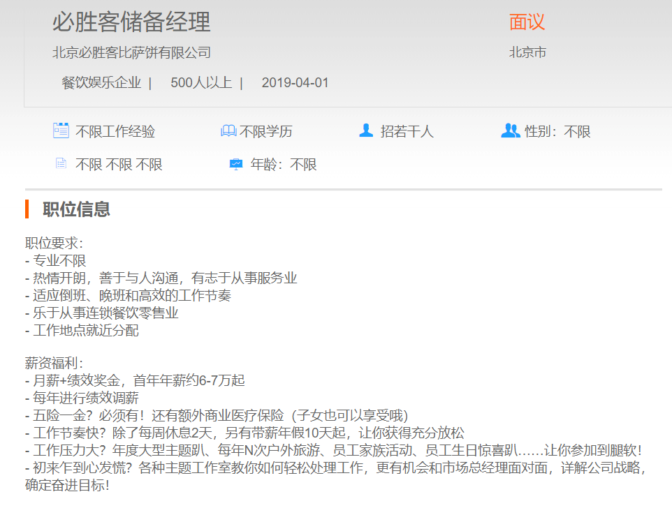 北京必胜客比萨饼有限公司必胜客储备经理