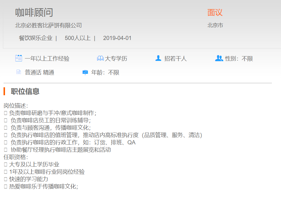 北京必胜客比萨饼有限公司咖啡顾问