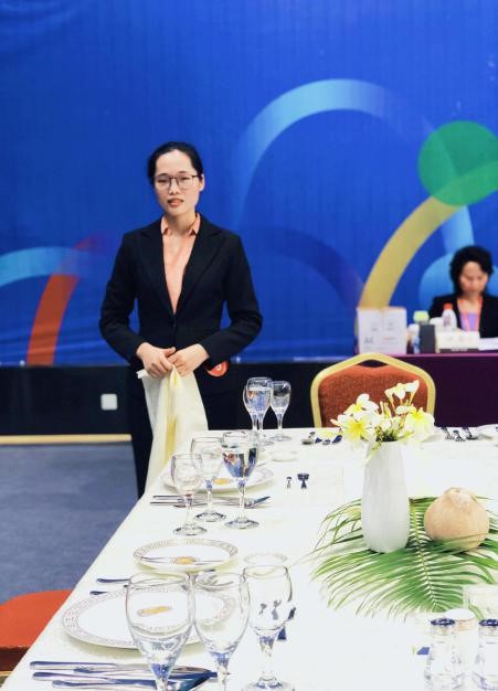 我院代表队参加了本次大赛本科组西餐宴会摆台、中餐宴会摆台、鸡尾酒调制和中式铺床4个项目,这也是我院首次参加全国性的大学生服务技能大赛。