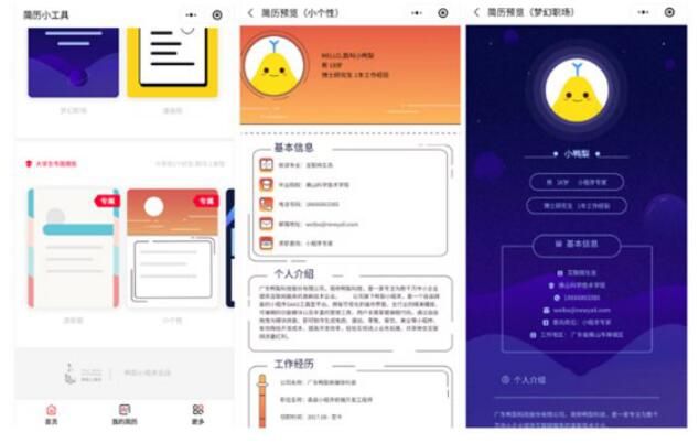 现在,将拥有10亿用户的微信平台作为招聘渠道的补充,且以小程序简历作为求职的创新工具,能够收获更多工作机会。通过“简历小工具”制作的小程序简历,不仅可以摆脱纸质文件的限制,支持图片、视频上传功能,让简历内容更显“有声有色”,同时还能通过微信将简历和个人作品以简历小程序的形式一键发送给HR,做到和HR随时沟通,即时获得面试反馈的求职体验。