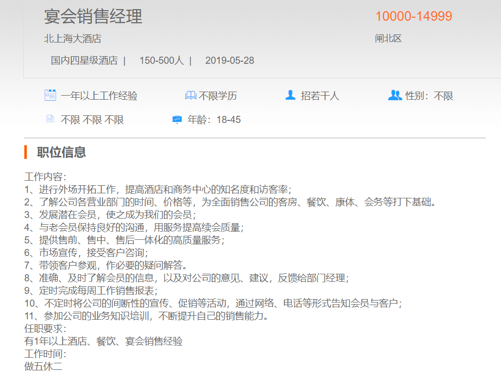 北上海大酒店宴会销售经理