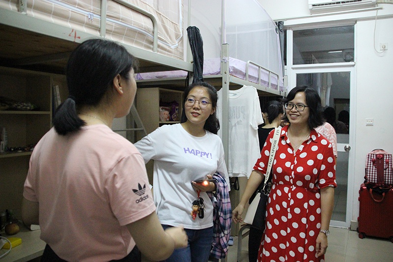 吴小柳老师主要走访会展1901班男女寝室,刘文琦老师与临时班主任负责走访慰问旅游管理和酒店管理男女寝室。在走访过程中,吴老师亲切问候每位学生,细致了解新生住宿情况和是否适应新环境等问题。学生积极与老师进行互动,询问关于中秋佳节活动内容,学生都表示愿意积极参加活动,不仅对个人特长的展现,更有利于加强学生之间的凝聚力。