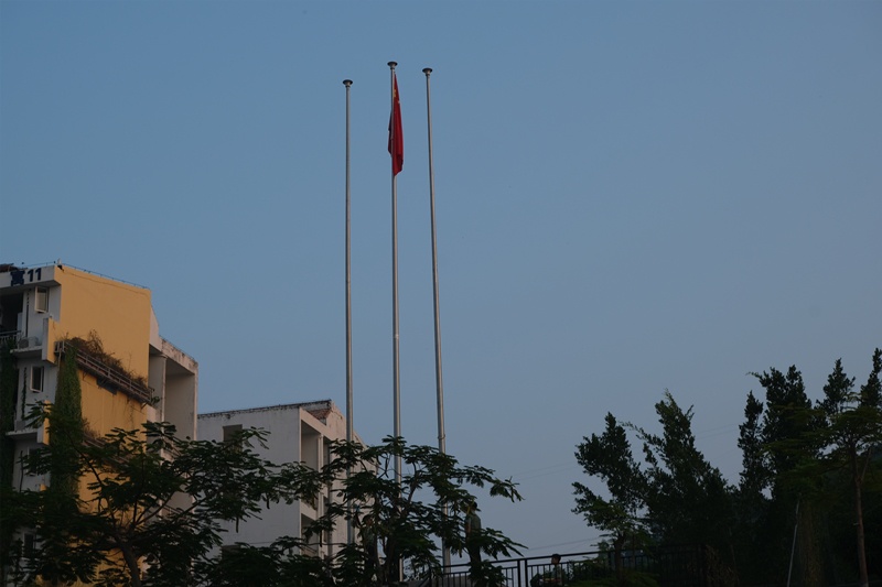 纵使寒风凛冽,我院学子们依旧精神抖擞,队列整齐划一。慷慨激昂的国歌奏响,五星红旗随着旋律徐徐上升,迎着朝阳摇曳飘荡,面对着这庄严肃穆的一刻,同学们全体肃立,唱响国歌,行注目礼。