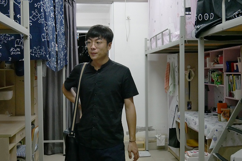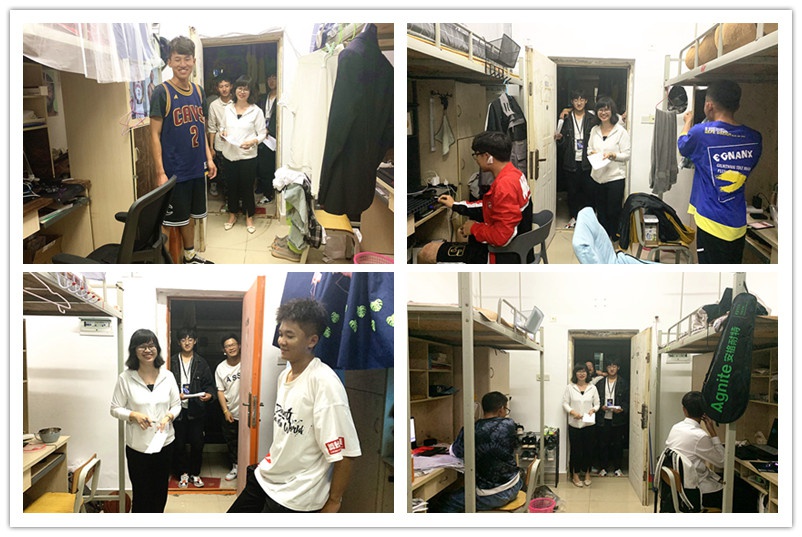 吴小柳书记主要从物品摆放、内务管理、有无异味等几个方面进行考察与评分,男寝整体上内务相对整齐,对整洁干净无异味的寝室表示满意,并要求继续保持。