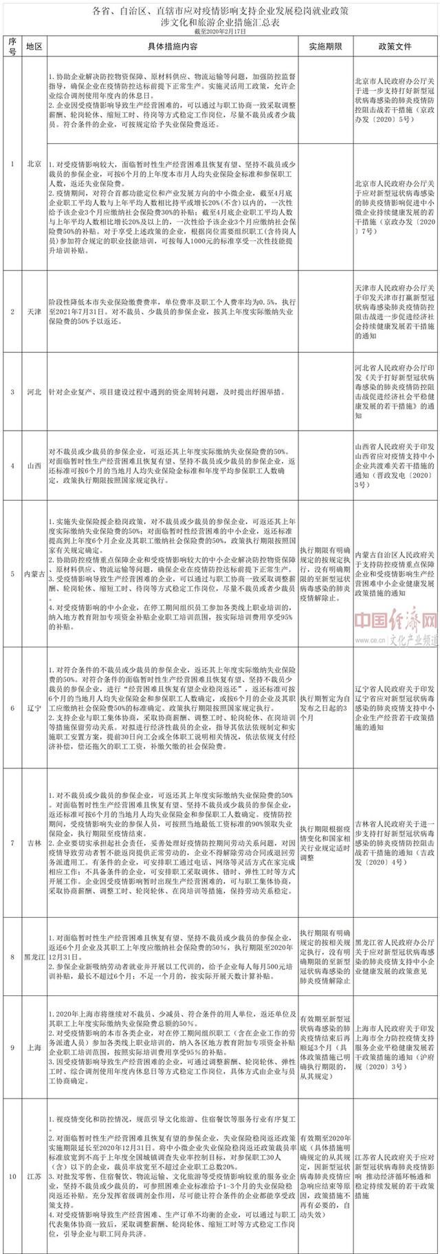 以下是全国各省市应对疫情影响支持企业发展稳岗就业政策涉文化和旅游企业措施汇总表: